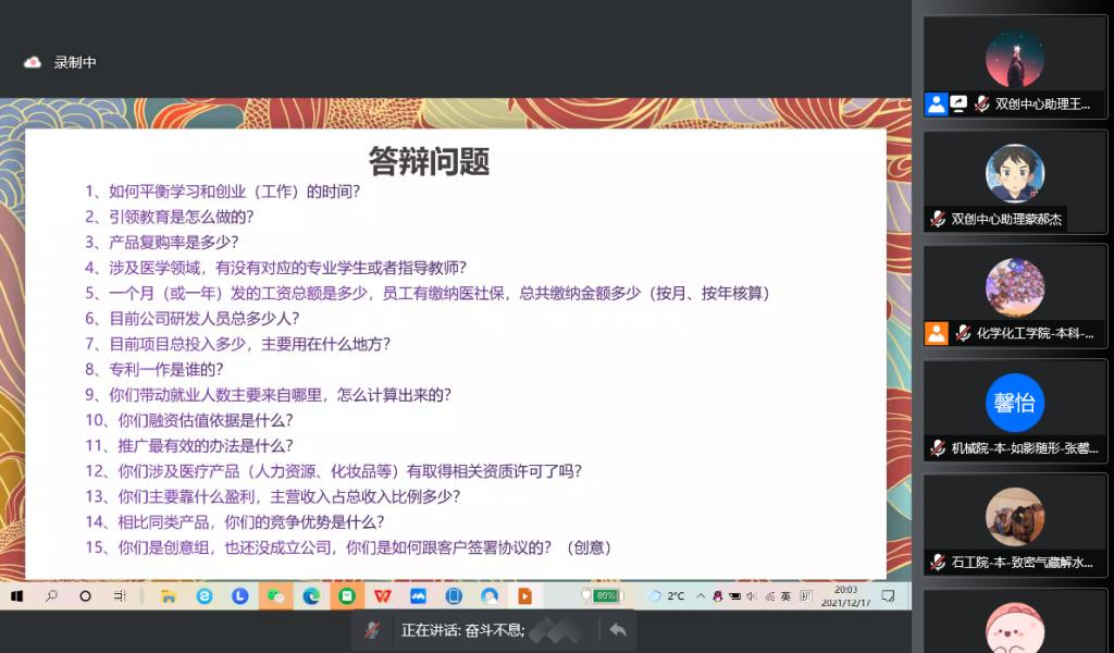 針對“如何準(zhǔn)備路演答辯PPT”的內(nèi)容,劉老師強(qiáng)調(diào),在準(zhǔn)備階段先做出項目的商業(yè)計劃書,再做好“減法”,濃縮項目精華,從而使路演PPT簡潔、清晰,突出項目優(yōu)勢及亮點(diǎn)。之后,劉老師總結(jié)了大賽路演環(huán)節(jié)選手“易錯題”集錦,對答辯時評委關(guān)注的熱門問題進(jìn)行總結(jié),并向?qū)W員們逐一講授應(yīng)對策略。在課程最后,劉老師悉心解答了學(xué)員們在課程學(xué)習(xí)當(dāng)中的疑問。