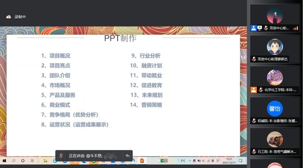 12月17日晚,由創(chuàng)新創(chuàng)業(yè)中心主辦的西安石油大學(xué)2021年大學(xué)生創(chuàng)新創(chuàng)業(yè)訓(xùn)練營第八講順利開課。本次課程以《路演技巧和流程》為主題,訓(xùn)練營全體學(xué)員參加了本期課程。