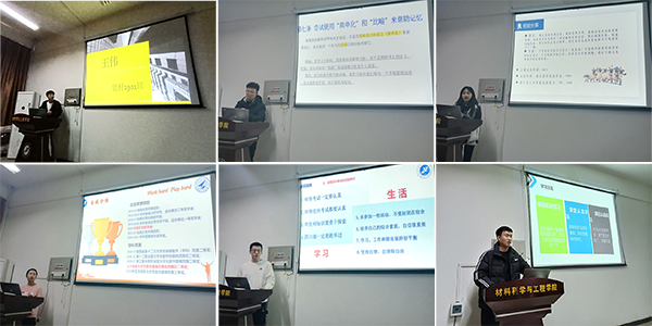 材物1901班陳瀟瀟從學(xué)習(xí)時(shí)間安排、不同時(shí)間段的學(xué)習(xí)計(jì)劃等方面,介紹了高效學(xué)習(xí)方法,并向所有班委同學(xué)傳授了兼顧學(xué)習(xí)和班級(jí)管理工作的寶貴經(jīng)驗(yàn),為班委明確學(xué)習(xí)和工作目標(biāo),樹(shù)立了良好的榜樣。材物1801班李思瀾現(xiàn)已保研成功,她以自己的親身經(jīng)歷為能材21級(jí)學(xué)生介紹了考研和保研的經(jīng)驗(yàn),并強(qiáng)調(diào)大學(xué)學(xué)習(xí)中積極參加競(jìng)賽和科研項(xiàng)目的重要性。材物1801班胡騰介紹了自己的學(xué)習(xí)經(jīng)歷,提醒同學(xué)們要珍惜時(shí)間,把握當(dāng)下,強(qiáng)化自我管理能力,為自己的夢(mèng)想去拼搏。