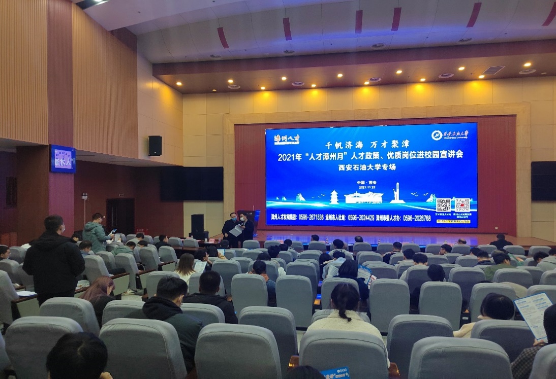 11月22日,漳州市科學(xué)技術(shù)局黨組書記、局長林鷺一行6人代表漳州市人才辦來我校舉行“人才漳州月”西安石油大學(xué)專場宣講會并簽訂校地合作協(xié)議。會議在鄠邑校區(qū)弘石報告廳舉行。就業(yè)指導(dǎo)中心全體工作人員,全校各院系畢業(yè)生代表參加會議。