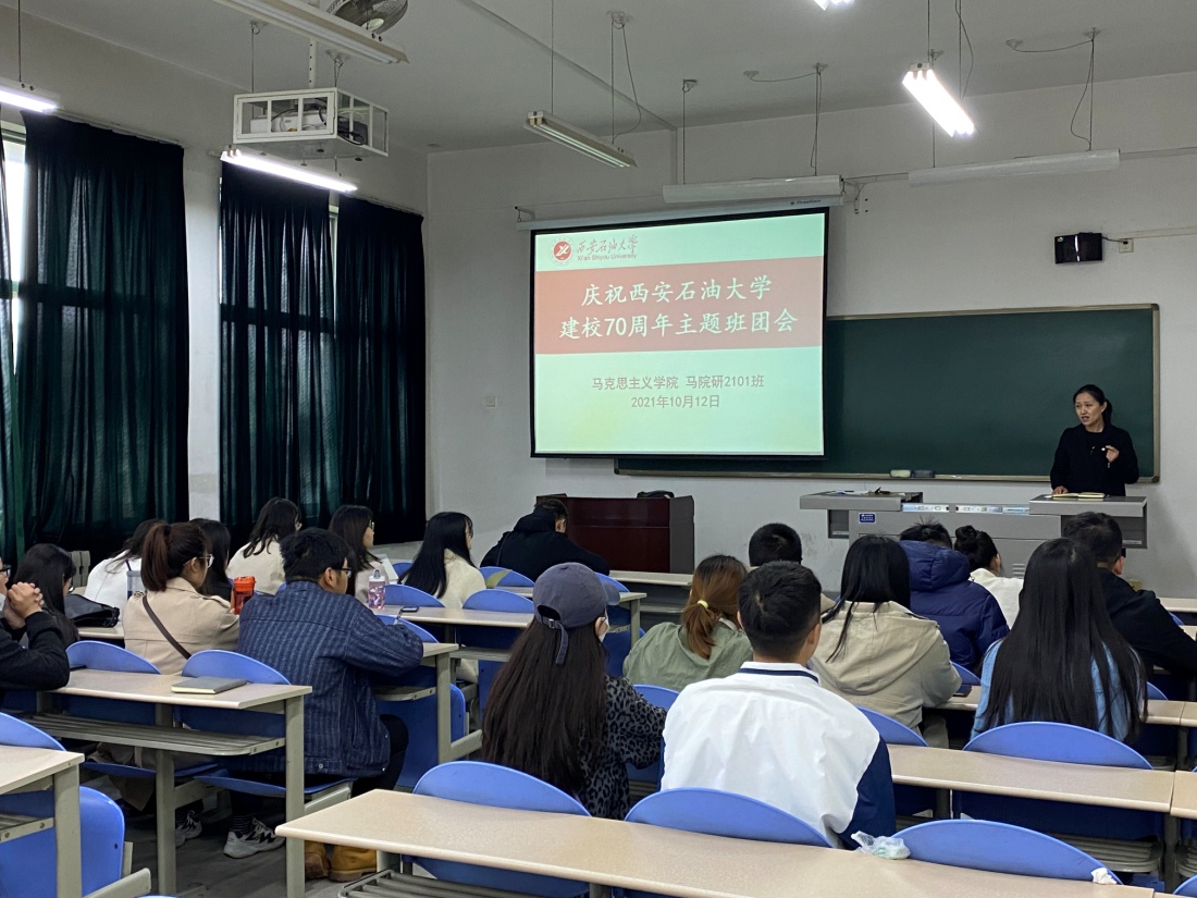 2021年10月12日正值我校70周年校慶,上午11時(shí),馬克思主義學(xué)院研2101班全體同學(xué)在鄠邑校區(qū)A407教室召開“慶祝西安石油大學(xué)建校70周年”主題班會(huì),會(huì)議由輔導(dǎo)員童玲老師主持,馬克思主義學(xué)院黨總支書記張偉出席班會(huì)。