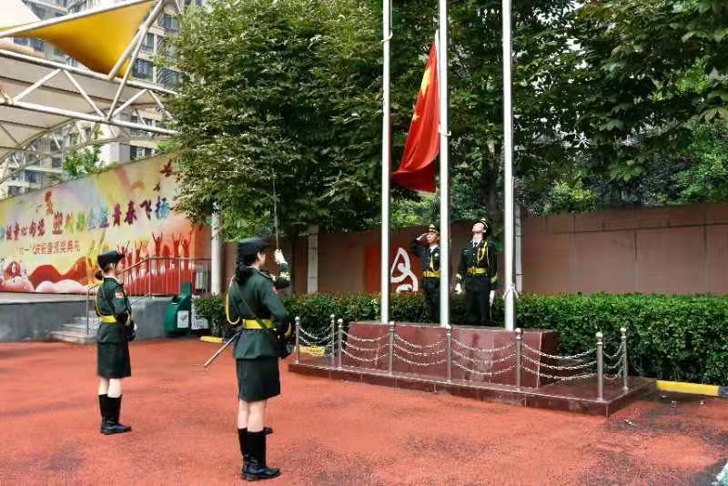 8時(shí)59分,在中國(guó)少年先鋒隊(duì)出旗曲伴奏下,大學(xué)生國(guó)旗護(hù)衛(wèi)隊(duì)員身姿挺拔,步伐整齊,列隊(duì)出旗。9時(shí)整,國(guó)歌嘹亮,五星紅旗冉冉升起,1500名少先隊(duì)員身著整齊的校服,佩戴著鮮艷的紅領(lǐng)巾,行少先隊(duì)隊(duì)禮,余未入隊(duì)一年級(jí)小學(xué)生行注目禮。