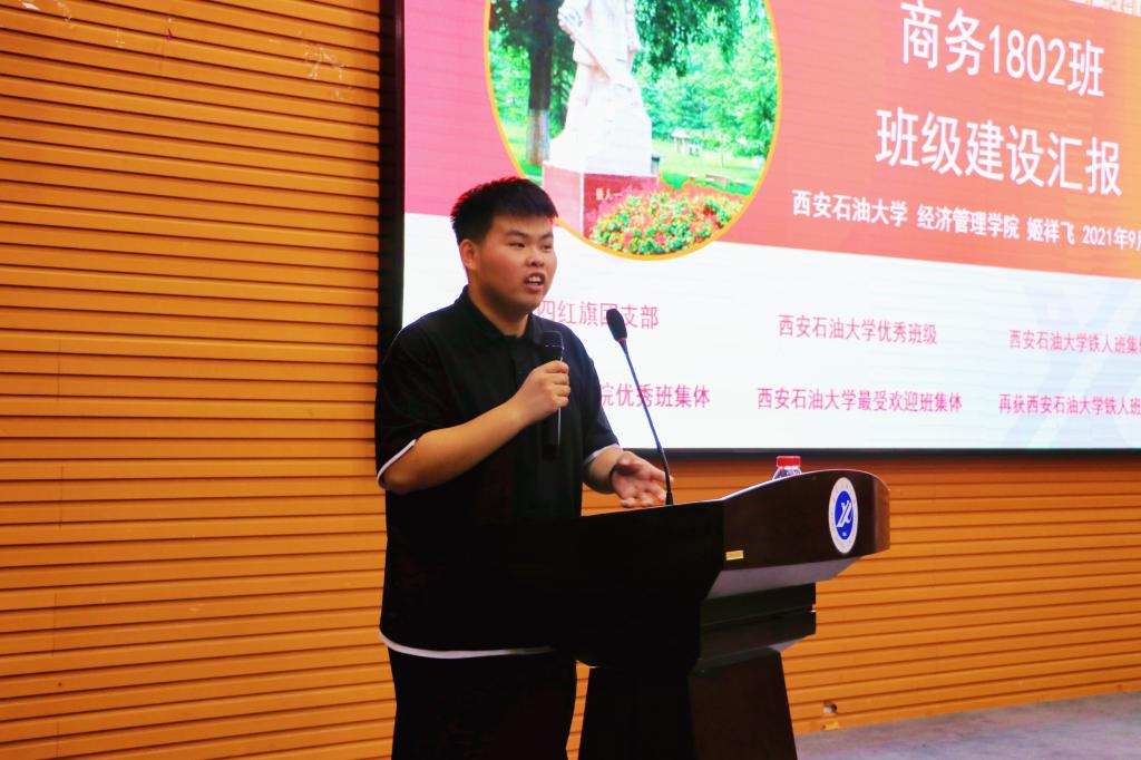 姬祥飛同學(xué)分別從班級構(gòu)成、思想建設(shè)、學(xué)風(fēng)建設(shè)、所獲成果等多方面全方位闡述了班級概況,展示了一個(gè)全面發(fā)展、多元立體的班級建設(shè)模式。包括姬同學(xué)在內(nèi)的12位班干部集體協(xié)調(diào)一致,帶領(lǐng)全班獲得五四紅旗團(tuán)支部、西安石油大學(xué)鐵人班集體等多項(xiàng)榮譽(yù),彰顯出為建設(shè)優(yōu)秀班集體,促進(jìn)全班同學(xué)的自我實(shí)現(xiàn)所付出的努力。