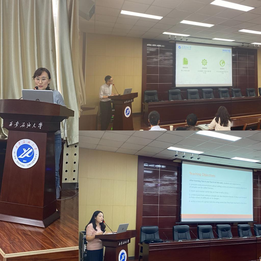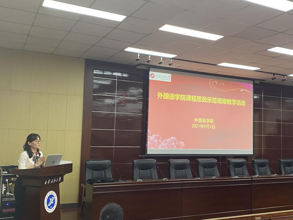 教學(xué)觀摩前,教務(wù)處副處長吳勛和外國語學(xué)院院長于艷英分別從國際形勢(shì),外語教學(xué)等方面強(qiáng)調(diào)了課程思政的重要性做了講話。教學(xué)示范觀摩活動(dòng)特邀請(qǐng)我院在西安石油大學(xué)課程思政大練兵競(jìng)賽獲得二等獎(jiǎng)的周曉寒老師和在西安石油大學(xué)青年教師教學(xué)競(jìng)賽一等獎(jiǎng)的陳旭老師以及在“外教社杯”全國高校外語教學(xué)大賽陜西賽區(qū)三等獎(jiǎng)苗旸老師為大家做課程思政展示,老師們?cè)诮虒W(xué)活動(dòng)中將中外文化相結(jié)合,把課程思政融入到外語教學(xué)中,引導(dǎo)學(xué)生用外語講述中國故事,用外語傳播中國文化。