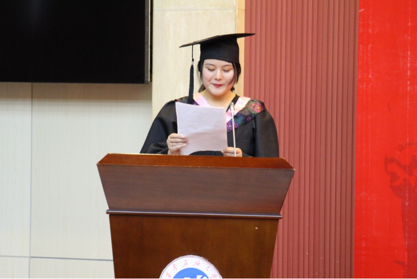 學(xué)院教授委員會(huì)主任、院長(zhǎng)王君萍教授致辭,回顧了2017級(jí)畢業(yè)生的求學(xué)歲月,表達(dá)了對(duì)畢業(yè)生的真摯祝福,要希望畢業(yè)生:一是堅(jiān)持修身立德,發(fā)揚(yáng)優(yōu)良品德;二是勇?lián)鷷r(shí)代重任,堅(jiān)守愛國(guó)信念;三是堅(jiān)定理想信念,爭(zhēng)做時(shí)代棟梁。導(dǎo)師代表、教授委員會(huì)副主任裴旭東教授寄語畢業(yè)生不斷求索,噴涌熱情,為母校增添光彩,他希望畢業(yè)生:一是希望大家堅(jiān)持學(xué)習(xí),追求卓越勇攀高峰;二是希望大家腳踏實(shí)地,頑強(qiáng)拼搏勤奮進(jìn)?。蝗窍M蠹覙酚^向善,心存美好幸福相伴。2021屆畢業(yè)生代表營(yíng)銷1701班唐穎同學(xué)發(fā)言,她回顧了四年大學(xué)時(shí)光,表達(dá)了對(duì)母校的感恩,并為學(xué)弟學(xué)妹送上祝福。