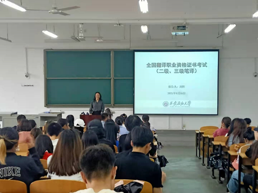 6月16日下午2:00,外國語學院在鄠邑校區(qū)B223舉辦了全國翻譯資格證書考試(二級、三級筆譯)輔導講座。講座由外國語學院副院長劉輝教授主講,并請2020級的兩名翻譯碩士研究生呂寒茹和杜佳郁進行了備考經驗分享,她們分別持有二級筆譯證書和三級筆譯證書。外國語學院英語系和翻譯系本科生參加了本次講座。