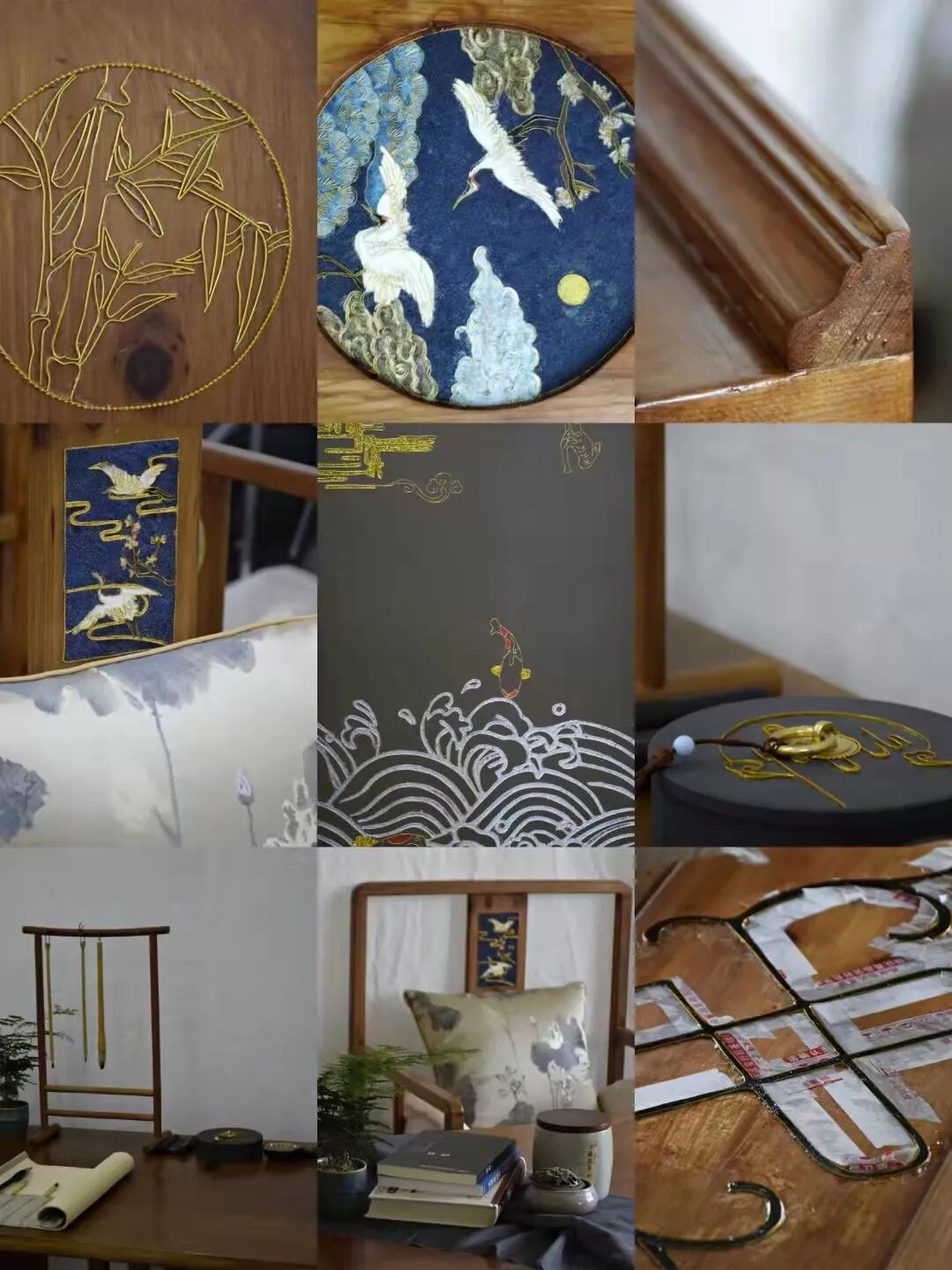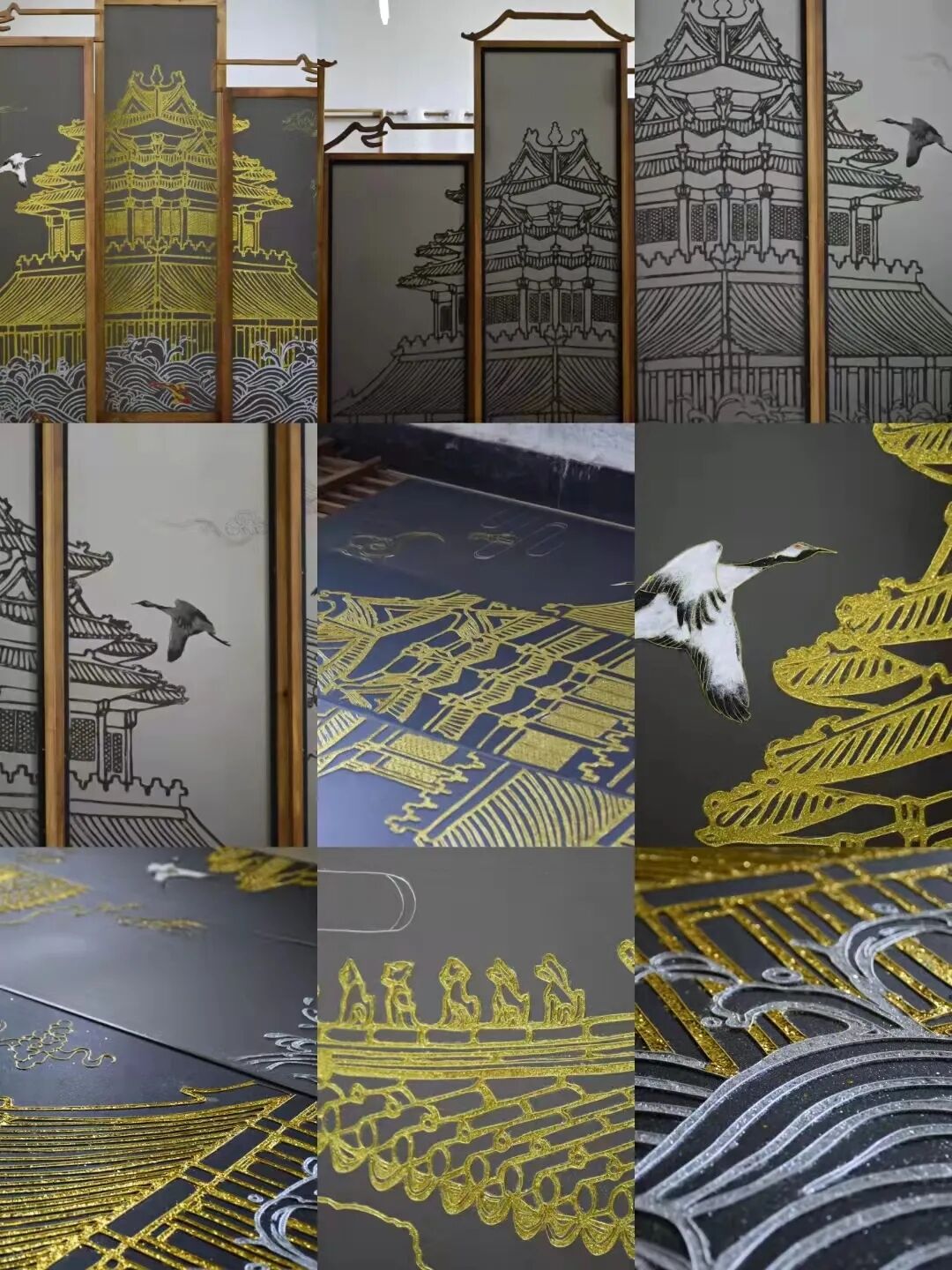 其一,大家了解的景泰藍(lán)就是銅胎掐絲琺瑯,其原理是一種在銅質(zhì)胎體上用柔軟的扁銅絲,掐成各種花紋焊上,然后把琺瑯質(zhì)的色釉填充在花紋內(nèi)燒制而成的器物。但要是以木質(zhì)家具為胎體進(jìn)行掐絲琺瑯就不能進(jìn)行燒制了,因而采用傳統(tǒng)熱工藝的現(xiàn)代改良法冷工藝進(jìn)行嘗試,直接在已經(jīng)涂飾過(guò)的家具表面進(jìn)行手工掐絲,然后填色,局部還會(huì)使用環(huán)氧樹(shù)脂膠進(jìn)行表面封層,最終形成展品中不僅木質(zhì)家具表面,甚至在輕薄的屏風(fēng)上,仿佛金線纏繞實(shí)則掐絲鑲嵌,一折一直都顯得立體生動(dòng),仙鶴更是有翩翩欲飛之意。