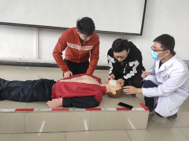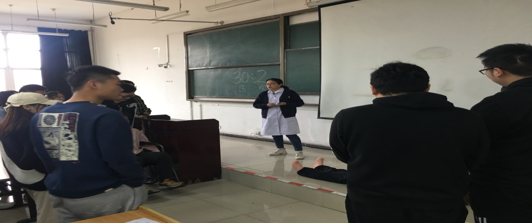 此次培訓(xùn)活動(dòng)內(nèi)容為:趙利劍醫(yī)師給同學(xué)們講解了理論知識(shí),包括創(chuàng)傷急救的應(yīng)急處理、心肺復(fù)蘇的流程及操作要點(diǎn)、燒燙傷及電擊傷的分級(jí)處理、急性CO中毒和火災(zāi)的應(yīng)對(duì)方法等等。講解結(jié)束后由劉偉醫(yī)師和宋彥霞護(hù)師對(duì)同學(xué)們就心肺蘇復(fù)實(shí)際操作過程進(jìn)行了詳細(xì)的指導(dǎo)。