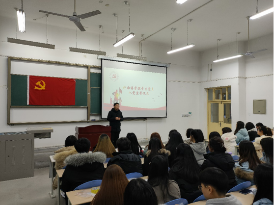 在奏唱莊嚴的《國際歌》后,專職組織員岳頔介紹本期預備黨員的基本情況,再次領學了共產(chǎn)黨員的權利和義務,通報了學院學生黨支部三會一課,主題黨日和黨員活動情況。