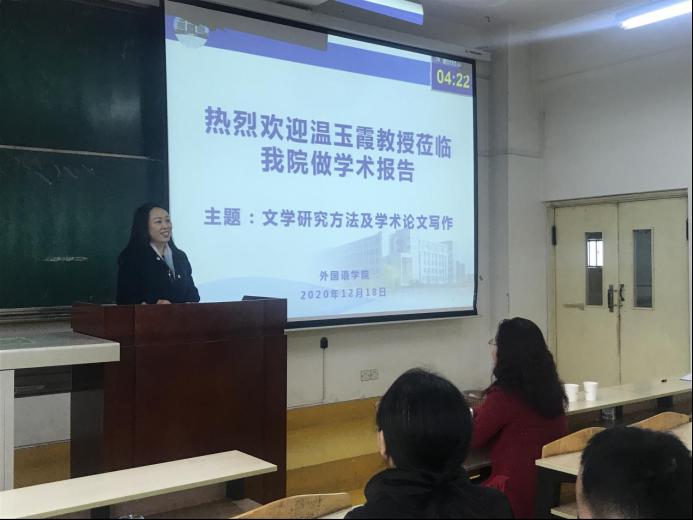 12月18日下午14:30,應(yīng)外國(guó)語(yǔ)學(xué)院邀請(qǐng),西安外國(guó)語(yǔ)大學(xué)溫玉霞教授在雁塔校區(qū)2-1102為我院師生帶來(lái)了題為“文學(xué)研究方法及學(xué)術(shù)論文寫(xiě)作”的專(zhuān)題報(bào)告。副院長(zhǎng)劉輝、學(xué)院全體教師及研究生參加了本次學(xué)術(shù)報(bào)告會(huì),報(bào)告會(huì)由劉輝副院長(zhǎng)主持。
