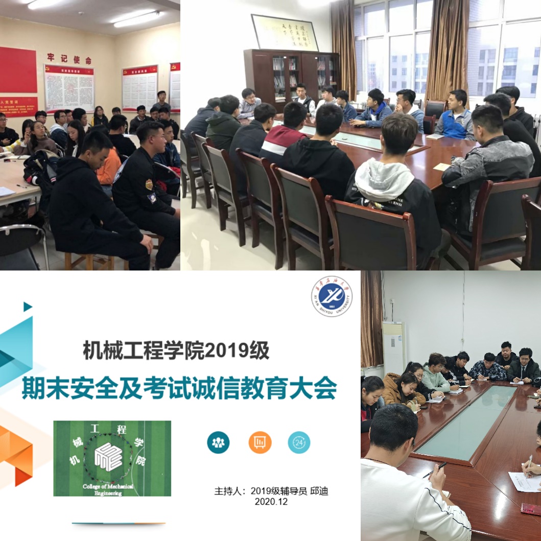 時值元旦假期與寒假來臨之際,為貫徹省、校關(guān)于疫情防控的相關(guān)部署,保證全院學(xué)生能順利完成本學(xué)期學(xué)業(yè)、平安地開啟假期生活,機(jī)械工程學(xué)院各年級于1227-30日通過線上線下結(jié)合的方式召開期末安全教育暨考試誠信教育大會。各年級輔導(dǎo)員主持會議。