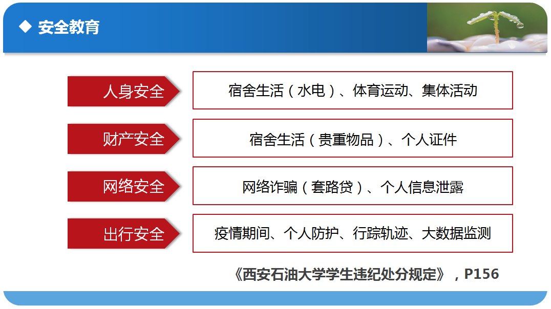 接著,李老師結(jié)合本學(xué)期返校后疫情防控期間的管理要求,從人身安全、財(cái)產(chǎn)安全、網(wǎng)絡(luò)安全、出行安全四個(gè)方面,以關(guān)鍵字和具體事例的相互串講,給大家上了一節(jié)實(shí)例滿滿的安全教育課,在重點(diǎn)時(shí)間節(jié)點(diǎn),再次提醒全體學(xué)生安全無(wú)小事、安全系大家,只有牢固樹(shù)立安全意識(shí),才能為祥和的校園生活提供保障。