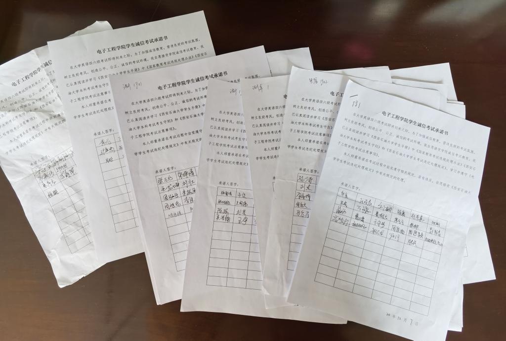 三是各年級(jí)輔導(dǎo)員老師通過年級(jí)QQ群向?qū)W生推送了《大學(xué)英語四六級(jí)考試注意事項(xiàng)》,提醒學(xué)生學(xué)習(xí)誠信考試相關(guān)校紀(jì)校規(guī)和法律法規(guī),提醒學(xué)生做好考勤各項(xiàng)準(zhǔn)備工作,全體學(xué)生簽署了《電子工程學(xué)院誠信考試承諾書》。