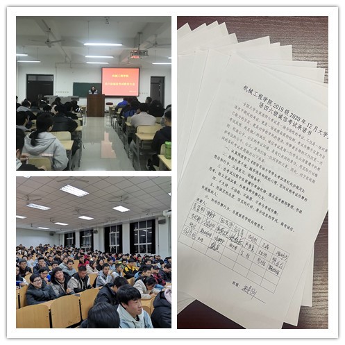 12月7日-9日,機械工程學院分年級、分批次召開英語四六級考試誠信教育大會,各年級輔導員老師主持會議,大會分別做考前動員和誠信教育。