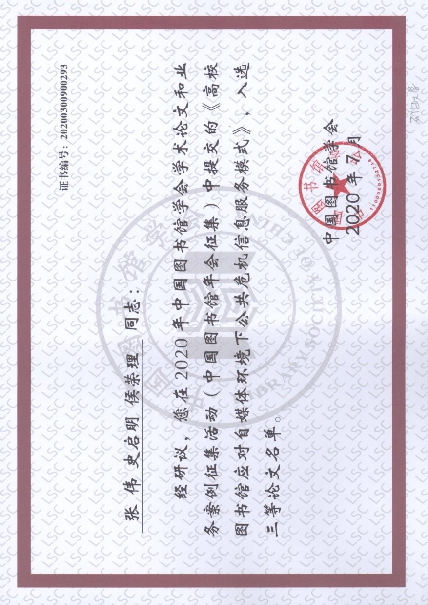 近日,我校圖書館張偉、史啟明、侯榮理提交的論文《高校圖書館應對自媒體環(huán)境下公共危機信息服務模式》入選2020年中國圖書館年會論文征集,榮獲三等獎。