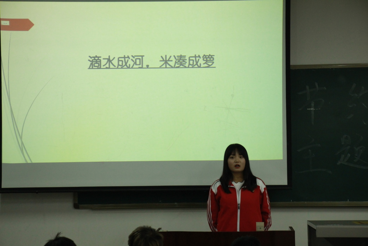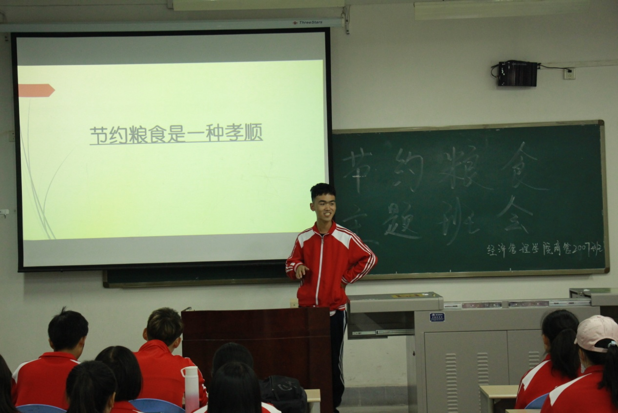 此次班會以“節(jié)約糧食”為主題,班會伊始,由主持人仇潤琦同學(xué)分析我國浪費糧食的現(xiàn)狀并提出節(jié)約糧食的重要性,呼吁大家身體力行的做好這件“小事”。緊接著由王啟妍同學(xué)從習(xí)近平總書記關(guān)于糧食規(guī)劃的重要指示、我國糧食發(fā)展歷程、我國糧食的基本國情、浪費大數(shù)據(jù)分析、貧困地區(qū)現(xiàn)狀、爭做時代青年六個部分進行講解和分析,結(jié)合PPT和視頻,給人以直觀的體會。接下來宿舍展示環(huán)節(jié),班級同學(xué)以宿舍為單位對“節(jié)約糧食”擬定主題標語,選出代表說出他們的標語并進行了簡單的講解。接著由主講人對外校以及我校關(guān)于“節(jié)約糧食、光盤行動”做出的行動進行了宣傳與普及,引導(dǎo)和鼓勵同學(xué)們積極踐行“節(jié)約糧食”。接著是宣誓環(huán)節(jié),老師同學(xué)齊宣誓,共同承諾踐行“節(jié)約糧食”這一重要事項。