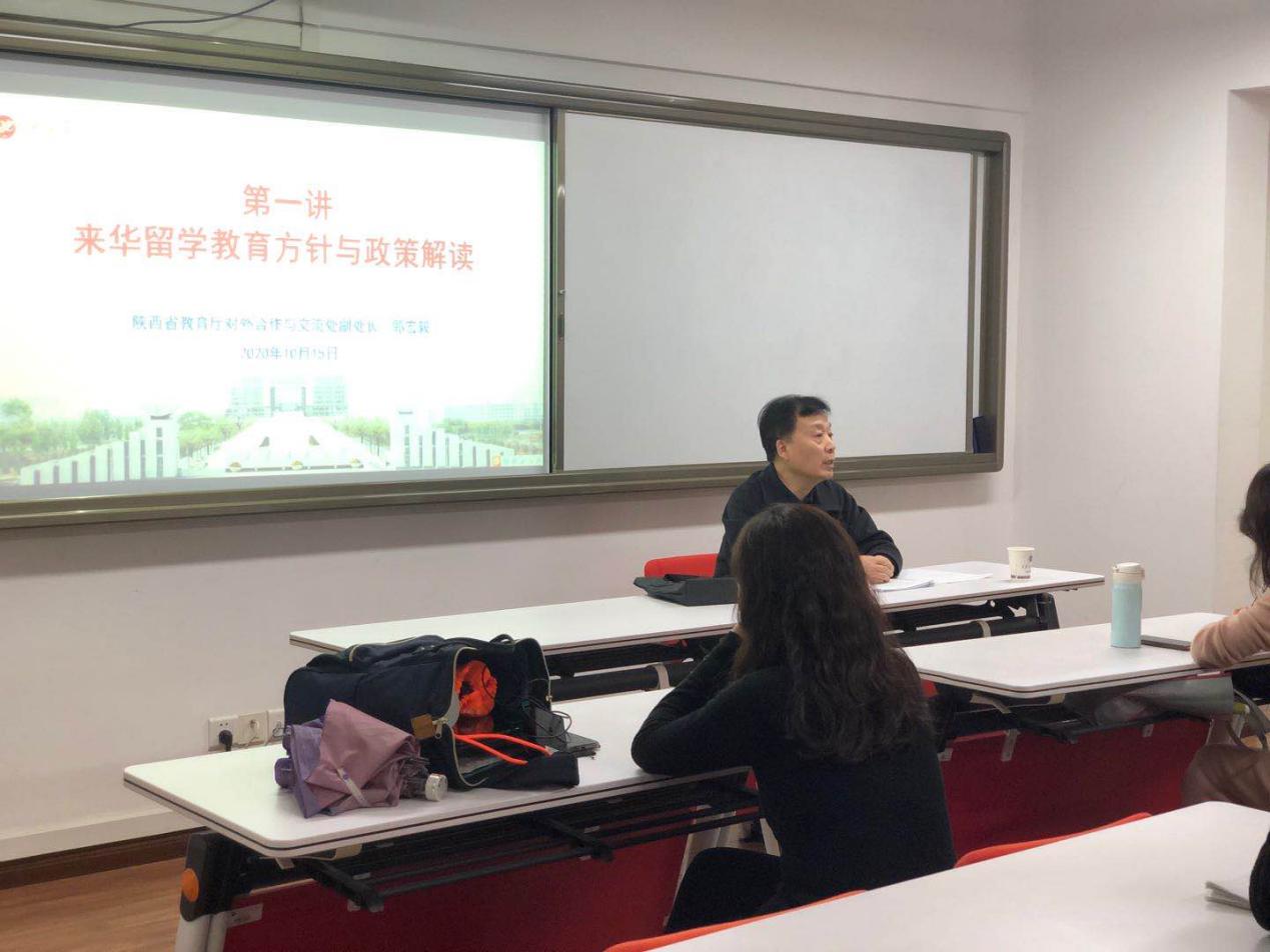 郭宏毅副處長以“來華留學教育方針與政策解讀”為題,從我國來華留學生發(fā)展過程及陜西省來華留學生發(fā)展現(xiàn)狀、陜西省來華留學生管理工作及取得的成績、留管干部工作建議及要求、今后來華留學生發(fā)展工作重點四個方面為主題,深入淺出,系統(tǒng)講解了來華留學生管理工作中的各項政策。此外,郭宏毅副處長結合實際案例,重點講解了突發(fā)事件處理、輿情管理、來華留學簽證審批表(JW202表)管理、如何實現(xiàn)提質增效等管理過程中的突出問題。