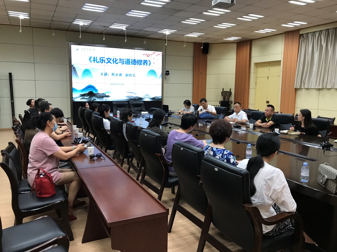 會上,副校長程永清作了題為《禮樂文化與道德修養(yǎng)》的專題講座。程校長分別從禮樂文化的內(nèi)涵、禮樂的作用和重要的意義以及道德的概念和提高修養(yǎng)的方法和途徑等方面對禮樂文化、禮樂與道德之間的關系進行了深刻詳細的解讀。程校長提出:一方面要加強學習,把學習作為一種追求、愛好和健康的生活方式,做到好學樂學;另一方面要以革新的姿態(tài)、發(fā)展的眼光,及時更新知識儲備,積極關注社會現(xiàn)實,真正做到與時俱進。