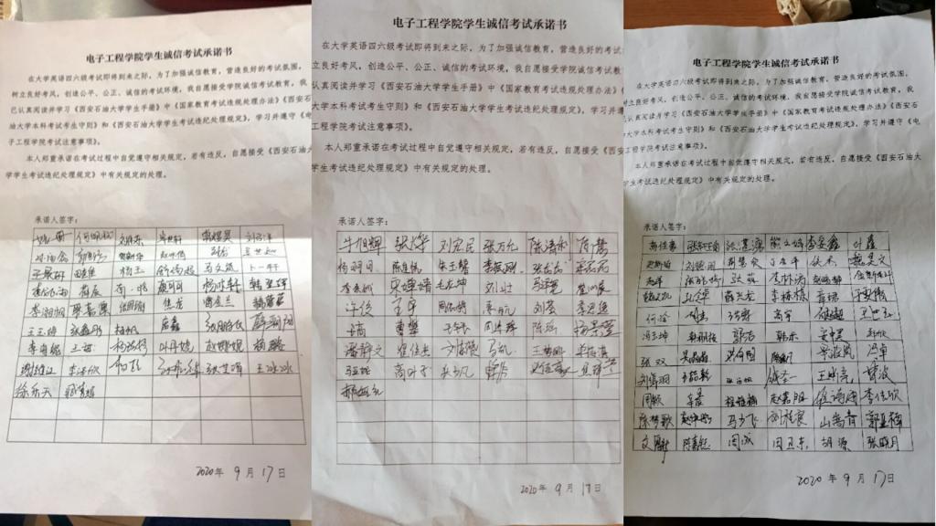 9月5日至6日組織我院學(xué)生簽署誠信考試承諾書。為進一步增強學(xué)生誠信意識,將誠信考試落到實處。各班通過組織學(xué)生簽署誠信考試承諾書這一儀式,確保將考試相關(guān)紀(jì)律要求傳達給每一名學(xué)生,要求學(xué)生們謹(jǐn)記承諾內(nèi)容,克服僥幸心理,認(rèn)真?zhèn)淇迹杂X抵制作弊行為。