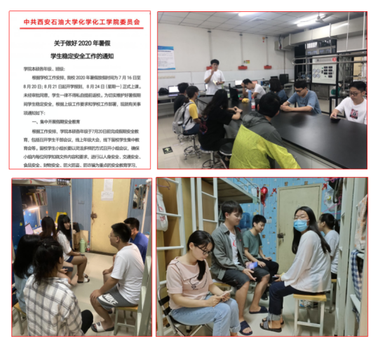 加強(qiáng)宣傳教育和思想引導(dǎo)。根據(jù)學(xué)校工作安排,化學(xué)化工學(xué)院印發(fā)《關(guān)于做好2020暑期學(xué)生穩(wěn)定安全工作的通知》,進(jìn)一步加強(qiáng)學(xué)生安全教育管理,強(qiáng)化預(yù)防,及時(shí)排查,安排值班,確保信息渠道暢通和各類突發(fā)事件處置及時(shí)有效處置。組織集中安全教育,包括召開學(xué)生干部會(huì)議,線上年級(jí)大會(huì),線下留校學(xué)生班組、宿舍教育會(huì)等,開展以人身安全、交通安全、食品安全、財(cái)物安全、防火防盜、防詐騙為重點(diǎn)的安全教育學(xué)習(xí),進(jìn)一步普及安全常識(shí),引導(dǎo)學(xué)生增強(qiáng)安全意識(shí),提高安全防范能力,自覺遵守各項(xiàng)安全管理規(guī)章制度,確保返鄉(xiāng)途中和社會(huì)實(shí)踐過程中的安全。對(duì)于留校學(xué)生,建立了7個(gè)虛擬班級(jí)43個(gè)小組,落實(shí)每日健康監(jiān)測(cè)和在校晚點(diǎn)名制度,對(duì)于離校學(xué)生,落實(shí)“一人一檔”信息臺(tái)賬,及時(shí)告知離校注意事項(xiàng)和暑期居家疫情防控要求。722日以來,新疆出現(xiàn)新冠疫情反復(fù)和西藏那曲發(fā)生地震后,學(xué)院第一時(shí)間與返鄉(xiāng)學(xué)生進(jìn)行聯(lián)系,逐一排查確定學(xué)生安全,統(tǒng)計(jì)受災(zāi)受損情況
