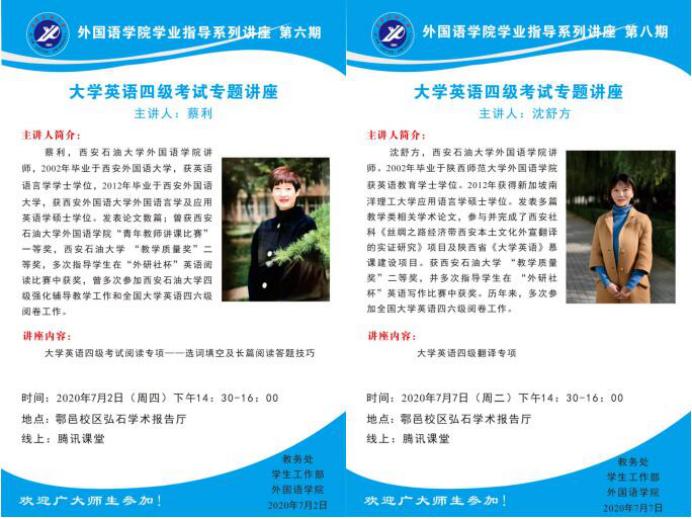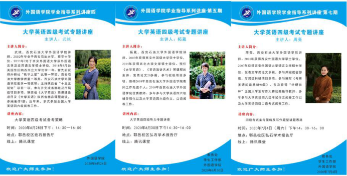為了讓我學(xué)生全面了解大學(xué)英語四級考試,提升大學(xué)英語四級通過率,在教務(wù)處和學(xué)生工作部的支持下,外國語學(xué)院6月29日至7月7日分別舉辦五場大學(xué)英語四級講座。此次講座面向全校學(xué)生以線上和線下兩種方式進(jìn)行,線下主會場設(shè)在鄠邑校區(qū)弘石學(xué)術(shù)報告廳,分會場設(shè)在各四級強(qiáng)化輔導(dǎo)班教室,線上使用騰訊課堂直播,截至目前為止我校共有5342名同學(xué)通過線上線下方式參加了此次系列講座。
