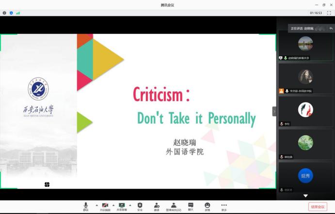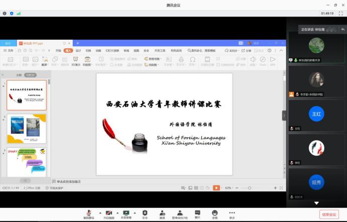 外國(guó)語(yǔ)學(xué)院于2020年6月24日早上8點(diǎn)半舉辦線上青年教師教學(xué)競(jìng)賽模擬演練暨專(zhuān)家點(diǎn)評(píng)會(huì)。本次活動(dòng)特邀陜西省“教學(xué)名師”袁森教授、校級(jí)本科教學(xué)督導(dǎo)組成員祖延秀老師及往屆外國(guó)語(yǔ)學(xué)院獲西安石油大學(xué)“教學(xué)質(zhì)量獎(jiǎng)”一等獎(jiǎng)的李紅、秦艷霞、李芳蕾老師和連續(xù)兩年獲得我校青年教師教學(xué)競(jìng)賽一等獎(jiǎng)的陳旭老師前來(lái)為大家分享經(jīng)驗(yàn)、做出點(diǎn)評(píng),并給出建議。