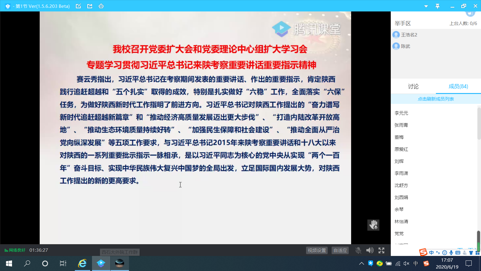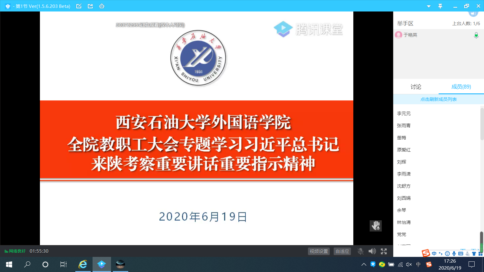 6月19日下午,外國(guó)語(yǔ)學(xué)院通過(guò)騰訊課堂的方式召開(kāi)全院教職工大會(huì),專題學(xué)習(xí)習(xí)近平總書記來(lái)陜考察重要講話精神。全院教職工參加會(huì)議,會(huì)議由學(xué)院黨委書記蔡強(qiáng)主持。