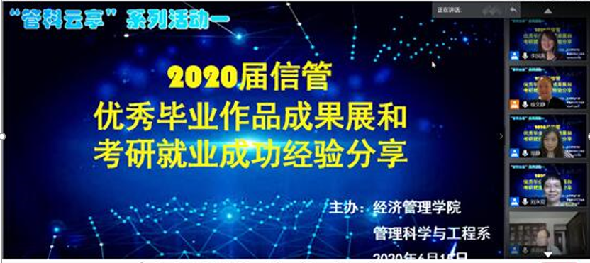 為了豐富“停課不停學(xué)”的線上教學(xué)活動(dòng),2020年6月15日下午14:30,經(jīng)濟(jì)管理學(xué)院管理科學(xué)與工程系信息管理與信息系統(tǒng)專業(yè)利用騰訊會(huì)議開展了一次師生共享的成果交流會(huì)。參會(huì)人員不僅包括學(xué)院的老師、在讀本科生,還特別邀請(qǐng)了已經(jīng)畢業(yè)的學(xué)生分享成功經(jīng)驗(yàn),參會(huì)人數(shù)達(dá)200多人。