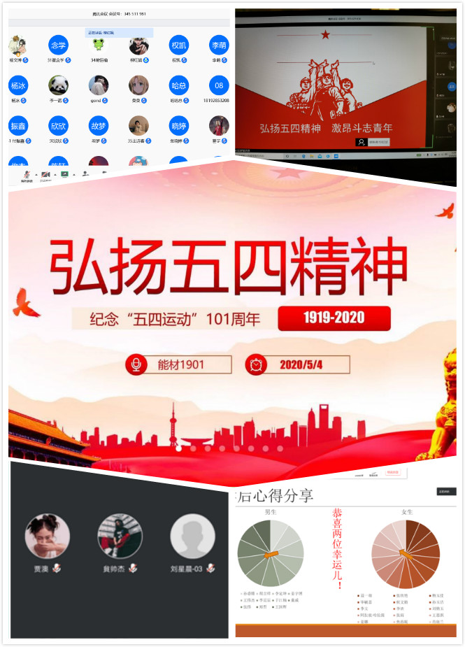 為紀(jì)念五四運(yùn)動(dòng)101周年,進(jìn)一步引導(dǎo)廣大青年團(tuán)員繼承和發(fā)揚(yáng)五四精神,展現(xiàn)當(dāng)代青年風(fēng)采。20205月,材料科學(xué)與工程學(xué)院各班、團(tuán)支部召開了以“傳承五四精神,弘揚(yáng)愛(ài)國(guó)情懷”、“青春向黨、歌頌五四”等為主題的線上班團(tuán)會(huì)。此次主題班團(tuán)會(huì)準(zhǔn)備充分,內(nèi)容充實(shí),形式多樣。通過(guò)線上學(xué)習(xí)習(xí)近平總書記五四寄語(yǔ)和優(yōu)秀青年事跡、唱團(tuán)歌、經(jīng)典誦讀、知識(shí)競(jìng)答、觀看五四精神紀(jì)錄片等方式,號(hào)召?gòu)V大團(tuán)員不忘入團(tuán)初心、牢記團(tuán)員使命,以實(shí)際行動(dòng)傳承五四精神、弘揚(yáng)愛(ài)國(guó)情懷。