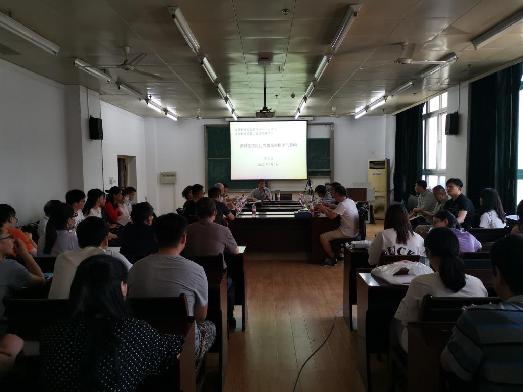 6月5日上午,副校長蘇文甫以《新冠疫情對世界格局和秩序的影響》為題,在雁塔校區(qū)2教402室為計算機學(xué)院全體教工黨員講授專題黨課。計算機學(xué)院黨委書記蔡建文主持本次黨課學(xué)習(xí)。