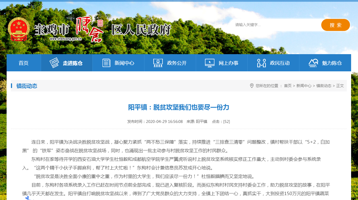 2020年是全國脫貧攻堅(jiān)決戰(zhàn)決勝之年,我們將全面建成小康社會(huì),實(shí)現(xiàn)第一個(gè)百年奮斗目標(biāo)。在脫貧攻堅(jiān)全面收官的關(guān)鍵階段,石油工程學(xué)院2017級(jí)杜恒毅同學(xué),因積極志愿參與當(dāng)?shù)孛撠毠?jiān)工作,近日受到寶雞市陳倉區(qū)政府和《陽光報(bào)》報(bào)道宣傳,該區(qū)人民政府特致電我校,對(duì)該生進(jìn)行表揚(yáng)。
