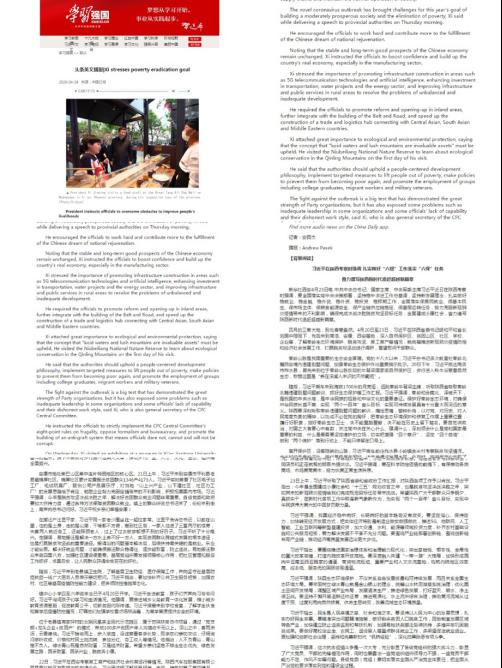 專題學習會上,通過原文學習新華社《習近平在陜西考察時強調(diào) 扎實做好“六穩(wěn)”工作落實“六?!比蝿?奮力譜寫陜西新時代追趕超越新篇章》,認真學習習近平總書記來陜考察重要講話重要指示精神,深刻學習領會習近平總書記關于新冠肺炎疫情常態(tài)化防控工作的重要講話和指示精神。通過《China Daily》頭條播報中《Xi stresses poverty eradication goal》一文和習近平總書記五四青年節(jié)對廣大青年的寄語雙語學習資料內(nèi)容進行重點學習,張帆老師還對習近平總書記來陜視察講話重要指示精神中的重點部分進行中英對照講解。