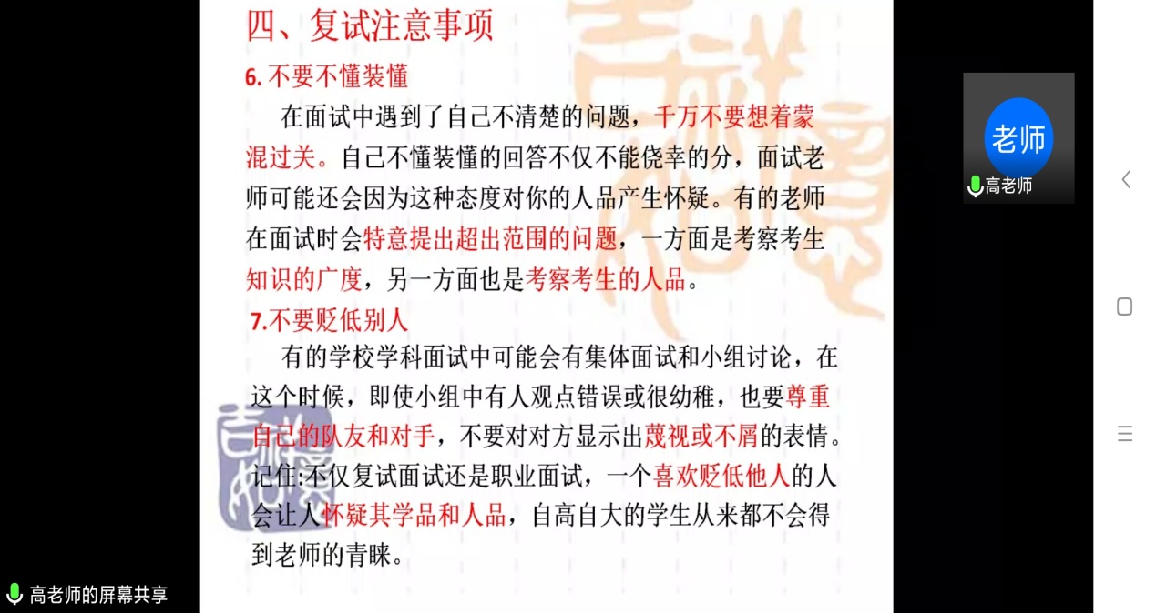 會上,高院長從復(fù)試的資格、復(fù)試的內(nèi)容和流程、復(fù)試能力要求、復(fù)試注意事項、如何準(zhǔn)備復(fù)試、考研調(diào)劑6個方面介紹了近幾年考研復(fù)試和調(diào)劑的政策、流程、變化趨勢和注意事項,提醒同學(xué)們注意調(diào)劑系統(tǒng)開放的時間、隨時關(guān)注研招網(wǎng)通知、注意與目標(biāo)意向?qū)煴3致?lián)系。高院長對同學(xué)們提出了三點建議,一是抓住機會,充分利用研究生擴招等國家利好政策,認真準(zhǔn)備復(fù)試或調(diào)劑;二是持續(xù)關(guān)注,積極備戰(zhàn),利用一切可以利用的資源和力量,與學(xué)院專任教師和輔導(dǎo)員保持聯(lián)系,暢通信息獲取渠道;三是調(diào)整心態(tài),保持樂觀態(tài)度,不因疫情而停滯或打亂自己的人生規(guī)劃。