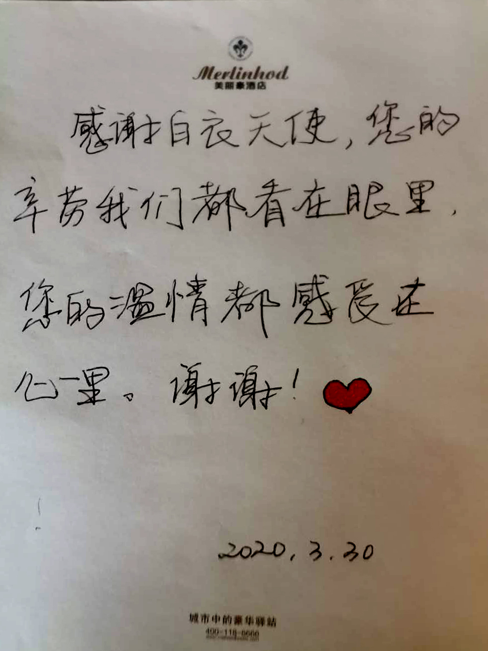 當(dāng)我們每次拖著疲憊的身體回房間時,看到多封暖心的感謝信,信中表示我們工作很辛苦,對我們衷心的感謝,期待我們也平安而歸,瞬間心暖,再累也值得,我想這是對我們最大的安慰和鼓勵??粗晃晃坏母綦x期滿的人員笑容滿面的離開,我們也算是心愿以償,一定不負(fù)校醫(yī)院院領(lǐng)導(dǎo)的重托,全力以赴地戰(zhàn)勝疫情,期待疫去花開,大家生活平安健康,我們平安而歸。