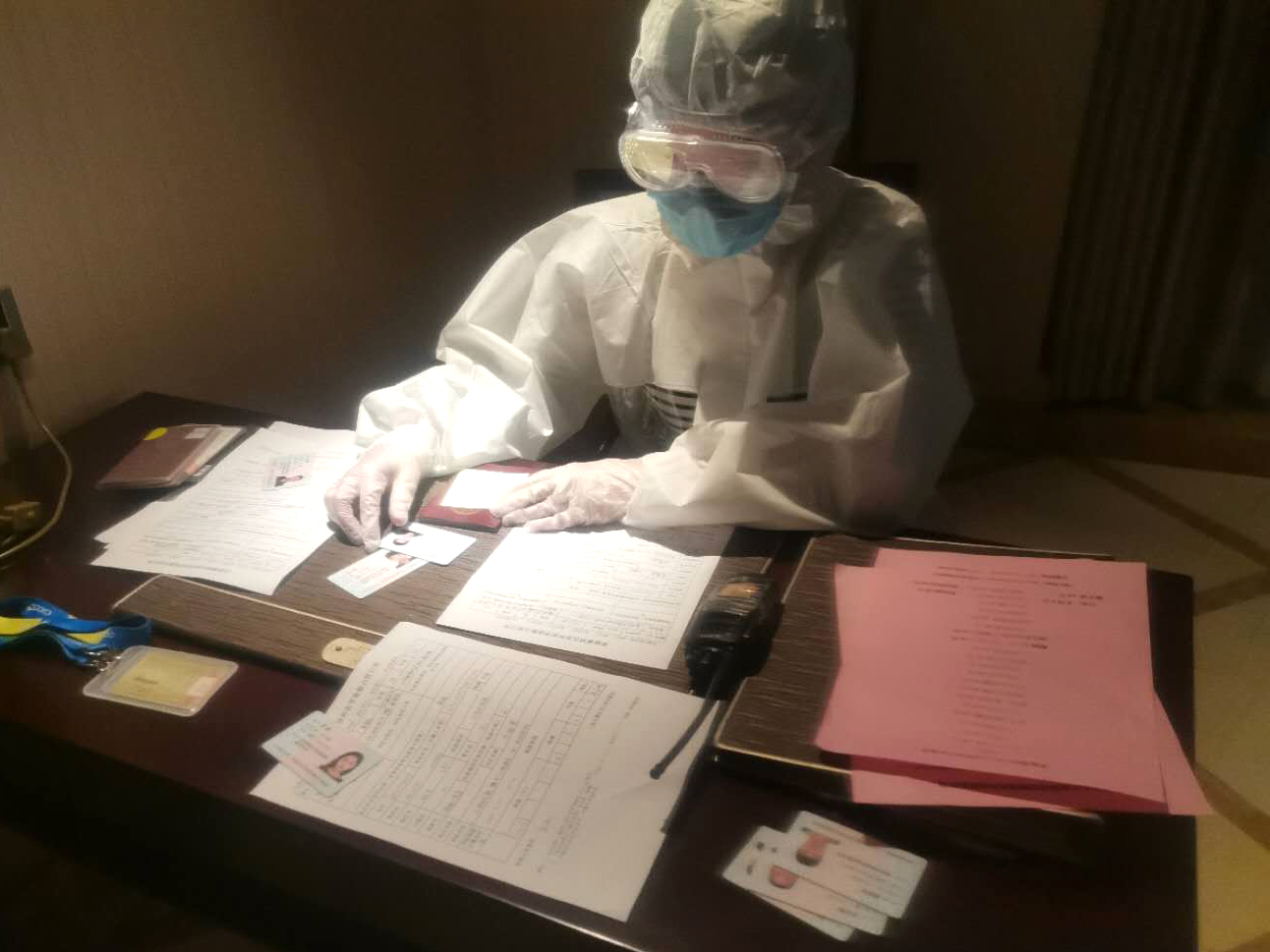 2020年4月1日晚,我們向往常一樣迅速穿好防護(hù)服進(jìn)入隔離區(qū)開始夜班的工作。接班后首先要通知當(dāng)天夜里需要解除隔離的人員,告知他們收拾好行李,等待解禁時間到來,把他們帶到安全通道,消殺完畢,辦理解禁手續(xù),看著他們平安的回家,大家心里也很欣慰。每天夜里11:00,我們需要把將近20個樓層的垃圾,全部裝袋運(yùn)送到樓下。夜班組多數(shù)是女孩子,看著樓下堆積如山的黑色袋子,望著姑娘們堅(jiān)強(qiáng)的身影,心中總會不禁感慨,只要我們齊心協(xié)力,一定會疫去花開,抗疫勝利。凌晨1:00以后,將會有很多境外回國的人員被指揮中心送來,對這些人員和他們的行李進(jìn)行消殺后,開始登記每一位隔離人員身份信息,記錄航班號、座位號,并且詢問一些病史,有沒有發(fā)熱、氣促、咳嗽等等,測完體溫后將他們按照國籍分配到不同的樓層。遇到高峰期,每晚通??梢允杖霂资舜巍C看蔚胶蟀胍沟臅r候,已連續(xù)工作4-5個小時,又渴又累又困,由于防護(hù)物資的緊缺,我們都能默默的忍耐著口渴,避免上廁所,以免造成防護(hù)物品的浪費(fèi)。沒有任務(wù)的時候大家抓緊時間休息,桌子、沙發(fā)、地板都是我們休息的地方。就這樣,一直到第二天早晨8:00交班迎接新的一天。