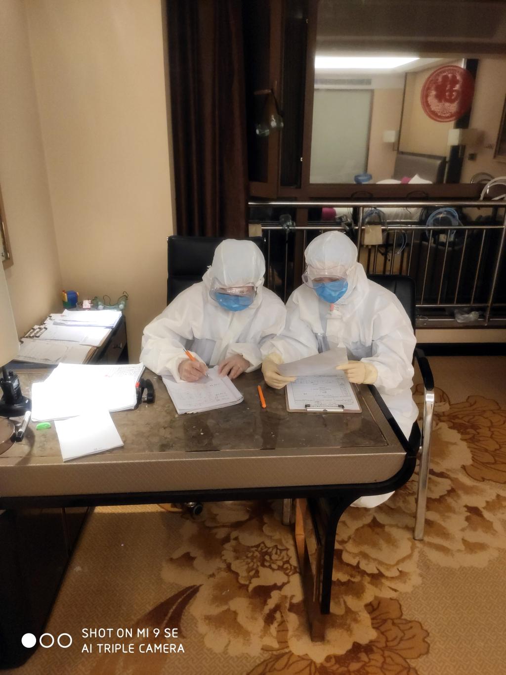 3月22日早上發(fā)餐時, 據(jù)了解在集中隔離的人員中有位身患高血壓,心肌梗塞以及腦梗塞的病人,一直有服藥時,且近期藥品快沒了,而且擔(dān)心會因旅途勞頓而致其不適,目前7人的醫(yī)療組里內(nèi)科專業(yè)的醫(yī)生只有我和姚剛,我們發(fā)揮了專業(yè)特長,耐心的詢問并記錄他的既往病史及服藥史,及時與其配備所需藥品,并在不影響他們休息時,隨時電話或當(dāng)面溝通他的現(xiàn)狀,讓他在隔離期內(nèi)不會因?yàn)樽约旱募膊《绊懰男那?。中午我和姚剛在隔離區(qū)內(nèi)上班時,突然接到工作組通知,此人于午飯后,突然出現(xiàn)眩暈、頭痛等不適,我們立即跑去查看,因手邊無任何醫(yī)療器械,只能一邊詢問一邊安撫患者的煩躁情緒,并通過上級工作組緊急協(xié)調(diào)來一個血壓計(jì),耐心問診及粗略檢查后才發(fā)現(xiàn),因近期飲食單一,且無法保證足夠的活動量,便秘明顯,而中午如廁時出現(xiàn)的短暫性血壓升高所致,立即通過工作組聯(lián)系酒店調(diào)整其為特殊餐,并告知其他個人應(yīng)該注意的事項(xiàng),每天至少一次問有無病情變化及情緒的波動,以保證其安全平穩(wěn)的度過隔離期。過后他拉著我們的手說:“你們真的是很辛苦,特別感謝你們這一段時間的照顧”對著我們的工作人員深深地鞠了一躬,當(dāng)時我瞬間濕了眼眶,因?yàn)槲腋惺艿降氖菄业陌莺兔褡宓哪哿Γ蛉绱?,才能使的我國渡過難關(guān)。