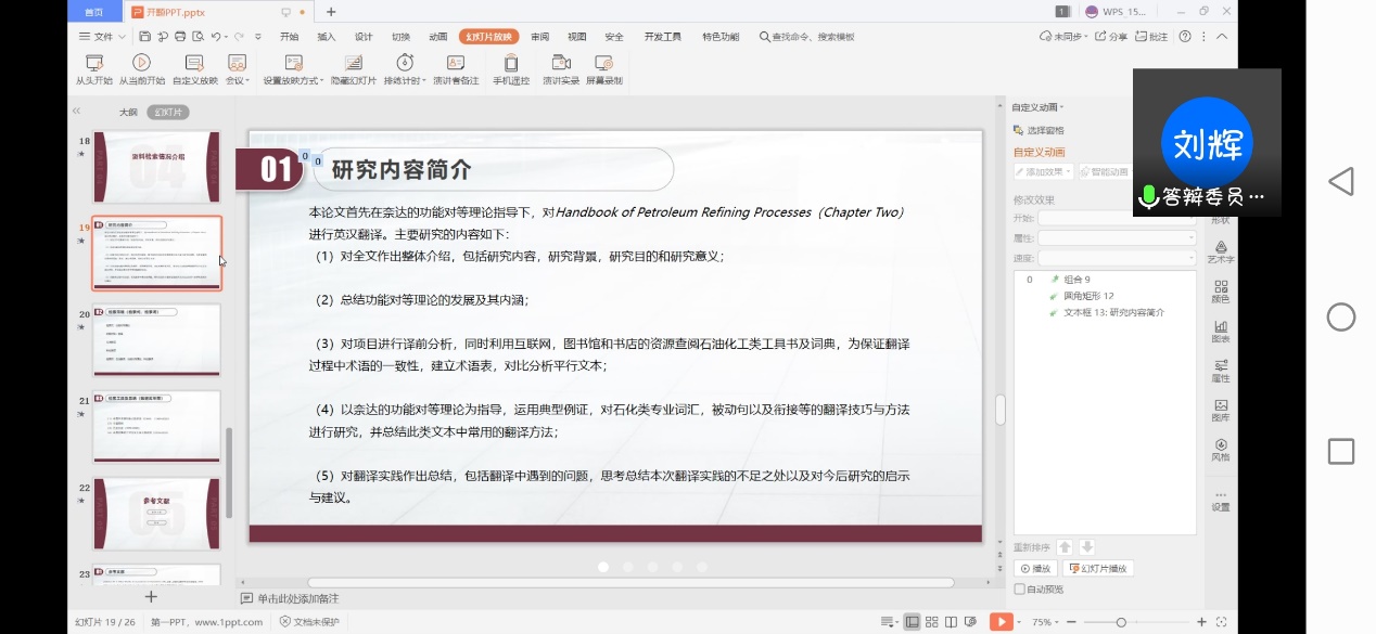 研究生學(xué)位論文開題是完成學(xué)位論文工作的基礎(chǔ),是保證學(xué)位論文質(zhì)量的重要環(huán)節(jié),為保證研究生培養(yǎng)質(zhì)量研究生學(xué)位論文水平,外國語學(xué)院依據(jù)研究生院《碩士學(xué)位論文開題管理補充規(guī)定》制定了2018級翻譯碩士研究生二次開題工作細(xì)則,并于43日上午,使用線上平臺(騰訊會議)進(jìn)行了2018級翻譯碩士研究生二次開題答辯會。答辯小組包括組長袁森教授,答辯委員劉輝教授和秦艷霞副教授,共有9名翻譯碩士研究生參加答辯。