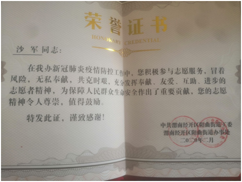 近日化學(xué)化工學(xué)院收到一封特殊的來信,函件來自中共渭南市經(jīng)開區(qū)陽曲街道工委,對化工研1801班沙軍同學(xué)在當(dāng)?shù)匾咔榉揽毓ぷ髦凶龀龅呢暙I(xiàn)提出褒揚,并感謝學(xué)校對人才的培養(yǎng)。表揚信中說,沙軍同學(xué)主動請纓加入當(dāng)?shù)乜挂呦蠕h志愿服務(wù)隊在工作中積極作為、吃苦耐勞、表現(xiàn)積極,充分展現(xiàn)了新時代青年大學(xué)生的風(fēng)采,當(dāng)?shù)亟值拦の?/span>沙軍同學(xué)等優(yōu)秀志愿者進(jìn)行了榮譽表彰。據(jù)了解,1月底開始,沙軍同學(xué)就一直志愿工作在當(dāng)?shù)氐囊咔榉揽貞?yīng)急分隊,承擔(dān)起對進(jìn)出人員及車輛進(jìn)行登記、消毒、宣傳等疫情防控工作。他表示:疫情暴發(fā)時,黨和國家立即組織力量投入到救治防控中,每次在抖音上看到新聞時,我都十分。就我們村而言,有人捐款捐物資,有人義務(wù)消毒滅殺細(xì)菌,也有人上門講解國家防控政策。就我個人而言,也是渴望著能為這疫情防控做一點貢獻(xiàn),所以我主動報名加入到我們村的志愿服務(wù)活動中,為家鄉(xiāng)的疫情防控工作奉獻(xiàn)自己微弱的力量。面對當(dāng)?shù)卣陌龘P,沙軍同學(xué)羞赧地表示他只是做了他認(rèn)為正確的事,今后他將化褒揚為動力,繼續(xù)做好志愿服務(wù),用實際行動做出表率。