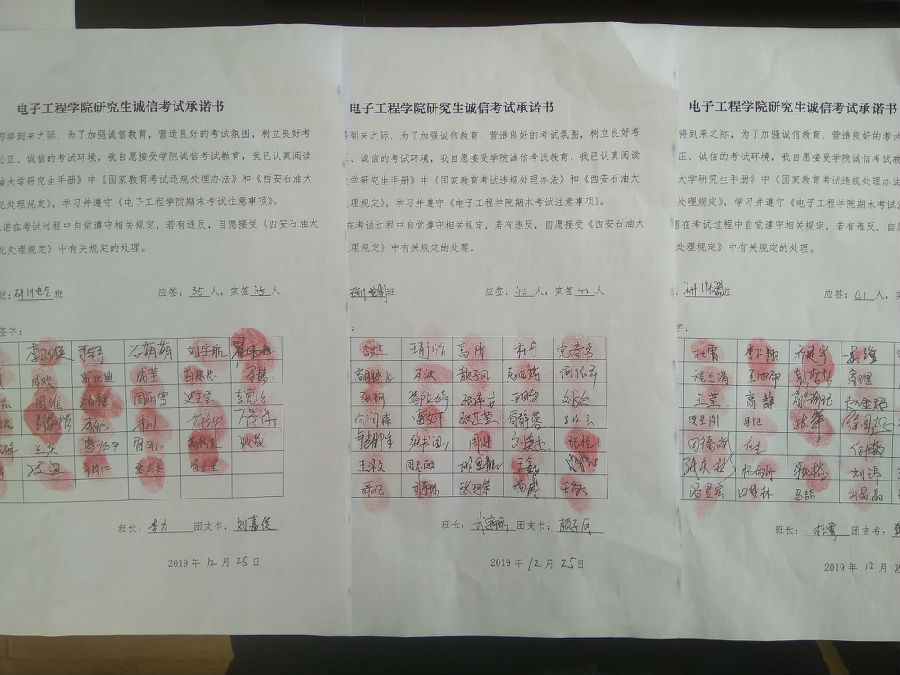 最后,周老師帶領(lǐng)同學(xué)們學(xué)習(xí)了《電子工程學(xué)院期末考試注意事項(xiàng)》,全體2019級(jí)研究生現(xiàn)場(chǎng)簽署了《電子工程學(xué)院研究生誠(chéng)信考試承諾書》并鄭重按下個(gè)人手印。同學(xué)們表示,在日后學(xué)習(xí)生活中將牢記學(xué)校 “兩個(gè)紅線”教育,誠(chéng)信考試、本分做人,用勤奮踏實(shí)的作風(fēng)譜寫人生華章,用真才實(shí)學(xué)報(bào)效國(guó)家,回報(bào)社會(huì)。