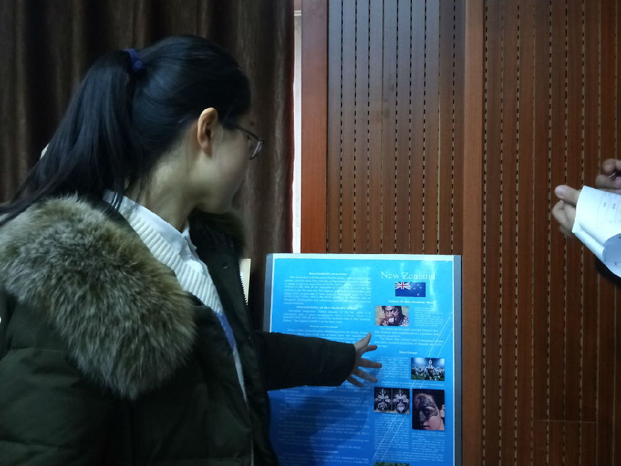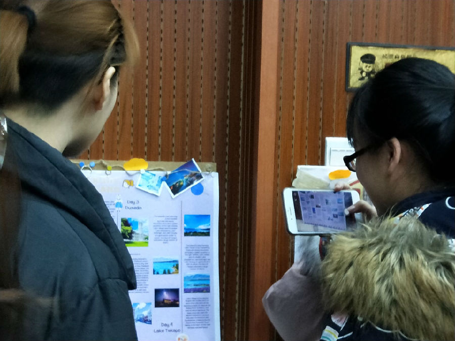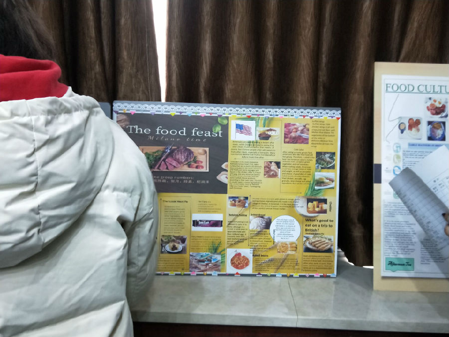 成果展示會上,各小組圖文并茂的展板吸引了一大波同學(xué)前去參觀。展板主題多樣,包括飲食、節(jié)日、音樂、旅游等,涉及美國、英國、加拿大、新西蘭等主要英語國家文化。