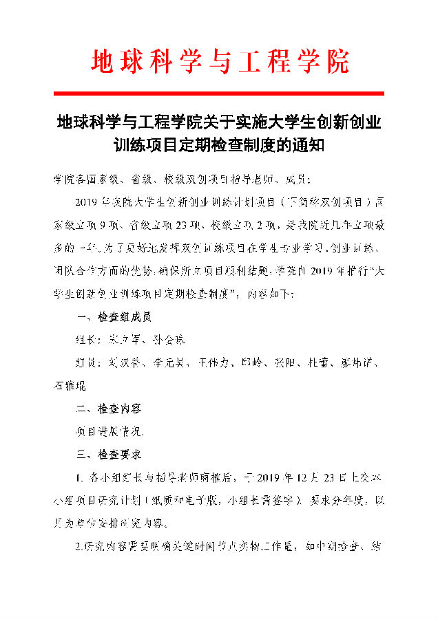 同時,為落實“以本為本”的育人宗旨,深入挖掘雙創(chuàng)項目育人功能,本學(xué)期學(xué)院成立了由主管教學(xué)的副院長、主管學(xué)生工作的副書記為組長,專業(yè)老師、雙創(chuàng)專干為組員的工作領(lǐng)導(dǎo)小組,制定了《地球科學(xué)與工程學(xué)院關(guān)于實施大學(xué)生創(chuàng)新創(chuàng)業(yè)訓(xùn)練項目定期檢查制度的通知》文件,從人員和組織制度上有效保證了我院雙創(chuàng)訓(xùn)練項目規(guī)范化運行。
