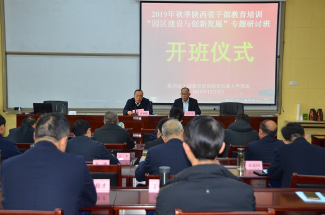 12月2日,2019年秋季陜西省干部教育培訓(xùn)“園區(qū)建設(shè)與創(chuàng)新發(fā)展”專題研討班在我校培訓(xùn)中心明德樓110教室順利開(kāi)班。干部教育培訓(xùn)西安石油大學(xué)基地辦公室主任、繼續(xù)教育學(xué)院院長(zhǎng)談建勤和來(lái)自全省各園區(qū)主管園區(qū)建設(shè)工作的30余位參訓(xùn)領(lǐng)導(dǎo)參加了開(kāi)班式。開(kāi)班式由繼續(xù)教育學(xué)院副院長(zhǎng)吳民生主持。