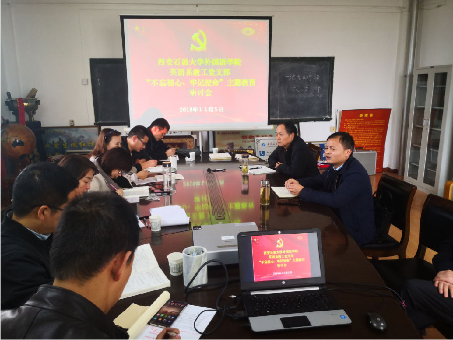 11月5日下午,外國(guó)語(yǔ)學(xué)院英語(yǔ)系教工黨支部在雁塔校區(qū)第一教學(xué)樓701會(huì)議室開(kāi)展了支部書(shū)記講黨課學(xué)習(xí)活動(dòng)暨“不忘初心、牢記使命”專(zhuān)題教育研討會(huì),研討會(huì)由外國(guó)語(yǔ)學(xué)院副院長(zhǎng)、英語(yǔ)系黨支部書(shū)記陳武主持。