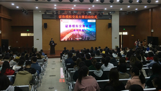 吳勛副院長在致辭中結(jié)合教育部召開的新時代全國高等學校本科教育工作會議的精神指出,全面提高高等教育質(zhì)量,本科教育至關(guān)重要,本次大賽的啟動就是要給我院大學生合理“增負”,這不僅有助于同學們做到知行合一,將理論知識轉(zhuǎn)化為實踐能力,也有助于我院的專業(yè)建設(shè)和學科發(fā)展。王天福副總經(jīng)理在講話中指出,本次大賽旨在為擬參與證券投資的同學搭建一個模擬證券交易的平臺和環(huán)境,進行專業(yè)知識教育和模擬交易,幫助同學們盡快熟悉證券交易規(guī)則,為后續(xù)的學習和工作打下良好基礎(chǔ)。趙海濤副書記宣布證券模擬交易大賽正式啟動。