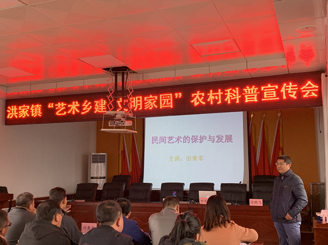 我校人文學(xué)院田榮軍博士以“民間藝術(shù)保護與發(fā)展”為主題,通過民間藝術(shù)保護現(xiàn)狀、存在問題、傳承發(fā)展三方面內(nèi)容,用大量生動實例向與會人員作了精彩的講解,為當(dāng)?shù)厝罕娤到y(tǒng)地梳理了民間藝術(shù)的理論認(rèn)知,進一步普及了保護和傳承民間藝術(shù),加強鄉(xiāng)村文化提升戰(zhàn)略,開展富有特色的藝術(shù)活動,打造藝術(shù)文化旅游品牌,凝聚鄉(xiāng)村活力,改善農(nóng)民精神風(fēng)貌,提高鄉(xiāng)村經(jīng)濟文化競爭力等多方面的內(nèi)容。
