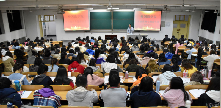 10月24日晚,外國語學(xué)院專業(yè)教育專題報(bào)告會(huì)在鄠邑校區(qū)A134教室召開,報(bào)告會(huì)由副院長陳武、英語系主任鐘澤波、俄語系主任李娜和翻譯系主任高鵬鵬主講。學(xué)管辦主任張帆主持了報(bào)告會(huì),2018級(jí)、2019級(jí)300余名學(xué)生參加了專題報(bào)告會(huì)。