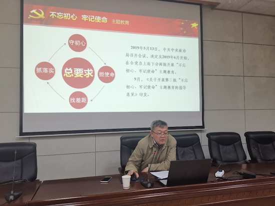 閆書記首先對“不忘初心、牢記使命”主題教育做了簡介。他指出,“不忘初心、牢記使命”主題教育是在全黨范圍內(nèi)開展的主題教育,是推動全黨更加自覺地為實現(xiàn)新時代黨的歷史使命不懈奮斗的重要內(nèi)容。2019年5月13日, 中共中央政治局召開會議,決定從2019年6月開始,在全黨自上而下分兩批開展“不忘初心、牢記使命”主題教育。9月,《關(guān)于開展第二批“不忘初心、牢記使命”主題教育的指導(dǎo)意見》印發(fā)。本次主題教育的總要求為守初心、擔使命,找差距、抓落實,根本任務(wù)是牢牢把握深入學習貫徹習近平新時代中國特色社會主義思想、錘煉忠誠干凈擔當?shù)恼纹犯?、團結(jié)帶領(lǐng)全國各族人民為實現(xiàn)偉大夢想共同奮斗,具體目標包括理論學習有收獲,思想政治受洗禮,干事創(chuàng)業(yè)敢擔當,為民服務(wù)解難題,清正廉潔作表率。