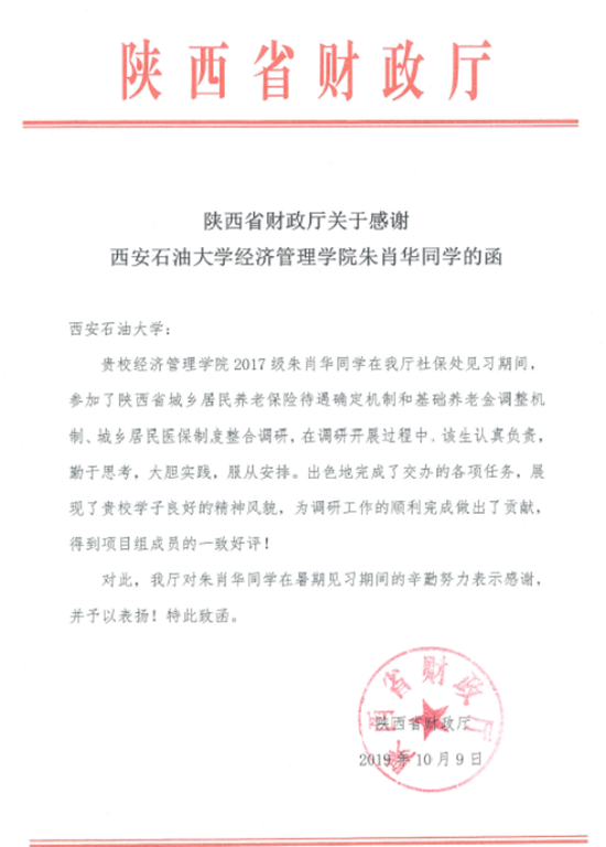 2019年暑期,朱肖華同學(xué)通過學(xué)校答辯評審,推薦參加陜西省人民政府暑假大學(xué)生到省級機(jī)關(guān)見習(xí)工作,被分配到陜西省財政廳社保處見習(xí)。在見習(xí)過程中,充分發(fā)揮專業(yè)優(yōu)勢,參與了陜西省城鄉(xiāng)居民養(yǎng)老保險待遇確定和基礎(chǔ)養(yǎng)老金調(diào)整機(jī)制調(diào)研工作,認(rèn)真負(fù)責(zé),表現(xiàn)突出,勇于擔(dān)當(dāng),積極建言獻(xiàn)策,主動解答問題,為全省民生社保工作的推進(jìn)發(fā)揮了積極作用,得到了財政廳調(diào)研組成員的一致好評,展現(xiàn)了我校學(xué)子的優(yōu)秀風(fēng)采。