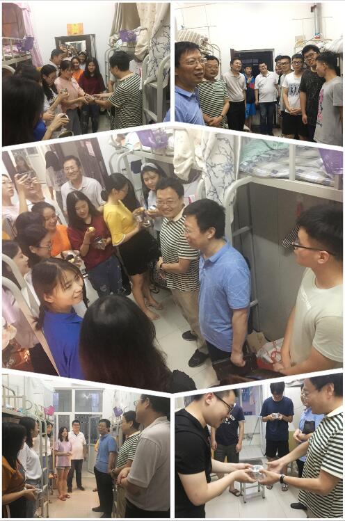學(xué)院黨政領(lǐng)導(dǎo)于6月27日晚上深入學(xué)生宿舍,看望畢業(yè)班學(xué)生。老師們對學(xué)生順利畢業(yè)表示熱烈祝賀,詳細(xì)詢問了學(xué)生的畢業(yè)去向,了解他們對學(xué)校工作的意見建議,并向讀研深造的學(xué)生發(fā)放學(xué)院精心定制的考研紀(jì)念品。馬行天書記寄語學(xué)生在新的平臺不斷努力、建功立業(yè),母校期待學(xué)子的好消息。譚成仟院長勉勵畢業(yè)生,青年學(xué)生應(yīng)該奮斗,不要在該奮斗的年齡選擇安逸。劉之的副院長說母校始終是學(xué)子心中的情節(jié),是學(xué)子的依靠,希望同學(xué)們有時間?;貋砜纯?。學(xué)生們表達(dá)了對老師和同窗的不舍之情和對母校四年培養(yǎng)的感激之情。