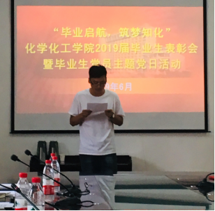 應化1502班姚思宇代表學院2019屆畢業(yè)生在發(fā)言向悉心培育自己的母校、親愛的老師和家長們致以最崇高的敬意和最誠摯的謝意,表示今后將永遠銘記母校給予的精神財富,懂得責任擔當,學會腳踏實地,永懷青春朝氣,勇于開拓進取,永不言敗,砥礪前行,爭取以優(yōu)異的成績回饋母校和社會。